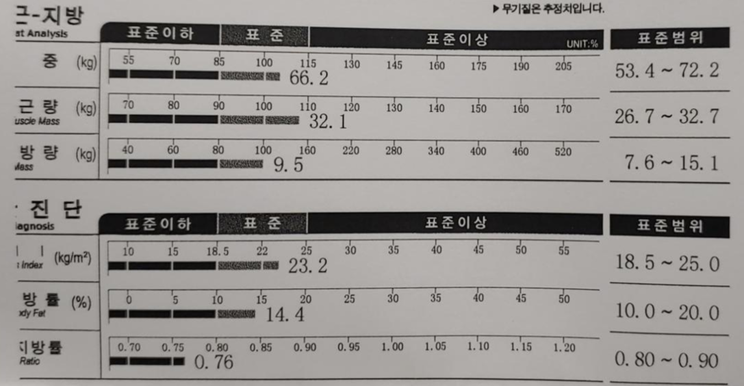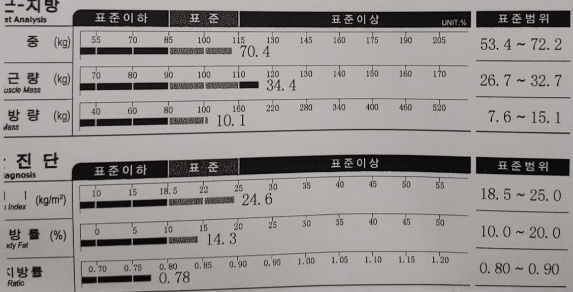 두 측정일의 날짜가 3일밖에 차이가 안 나지만, 측정값은 꽤 차이가 나는데요. 바디프로필 촬영일이 가까워질수록 변화가 더욱 뚜렷하게 나타납니다. 촬영 1주일을 앞두고(왼쪽 측정일) 이대로 망하는 거 아닌가 싶은 생각도 들었는데, 하루하루가 살 빠지는 게 느껴집니다.